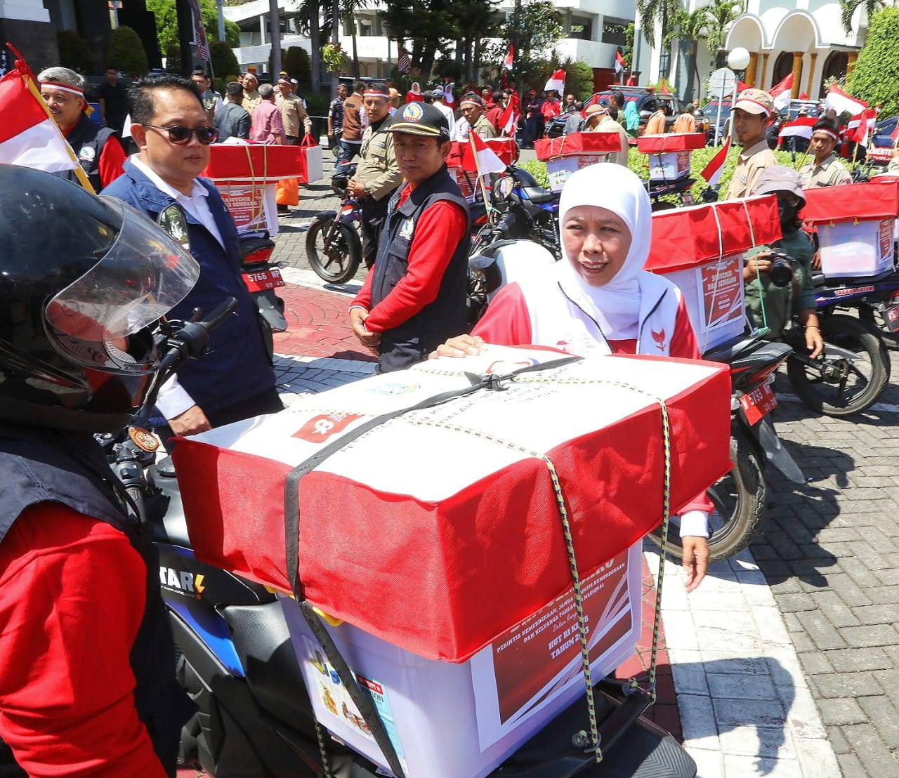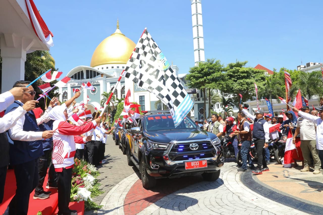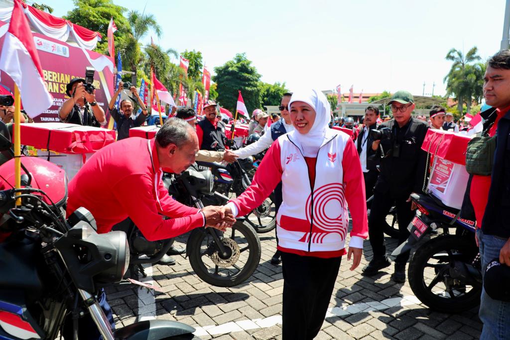 SURABAYA, KOREK.ID – (13 AGUSTUS 2023) Gubernur Jawa Timur Khofifah Indar Parawansa, memberangkatkan Tenaga Kesejahteraan Sosial Kecamatan (TKSK) dan Taruna Siaga Bencana (TAGANA) untuk menyalurkan tali asih kepada perintis kemerdekaan, janda perintis kemerdekaan, dan ahli waris keluarga pahlawan nasional di halaman Kantor Gubernur Jawa Timur, Surabaya, Minggu (13/8).