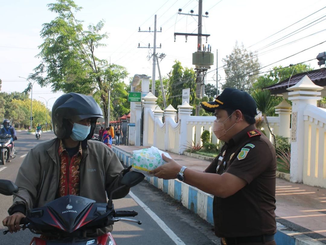 Dengan cara turun kejalan, Kepala Kejari Bangkalan Candra Saptaji bersama staf dan seluruh pegawainya membagikan 400 nasi kotak di Jl. Soekarno Hatta, depan kantor Kejaksaan setempat.