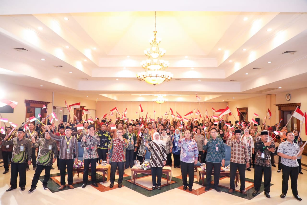 Pada kesempatan tersebut, Gubernur Khofifah juga mengajak para kepala desa melantunkan bersama lagu “Bendera” karya Cokelat Band sembari mengibarkan merah putih dengan semangat.