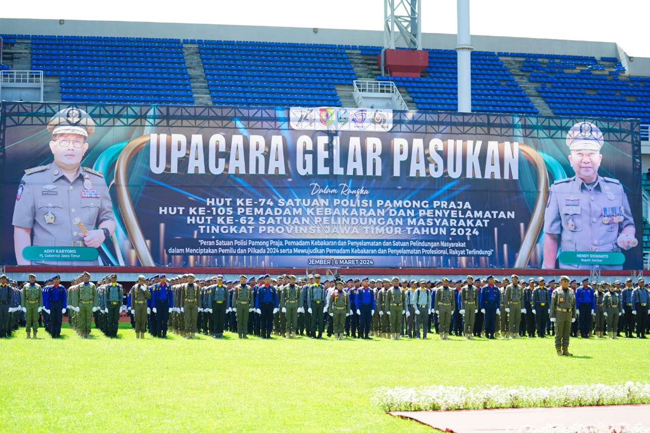 KAB. JEMBER, KOREK.ID – (6 MARET 2024) Penjabat (Pj) Gubernur Jawa Timur Adhy Karyono menjadi Inspektur Upacara (Irup) Gelar Pasukan dalam Peringatan HUT ke-74 Satuan Polisi Pamong Praja (Satpol PP), ke-62 Satuan Pelindungan Masyarakat (Satlinmas), dan ke-105 Pemadam Kebakaran (Damkar) Tingkat Provinsi Jawa Timur Tahun 2024 di Jember Sport Garden (JSG), Rabu (6/3).