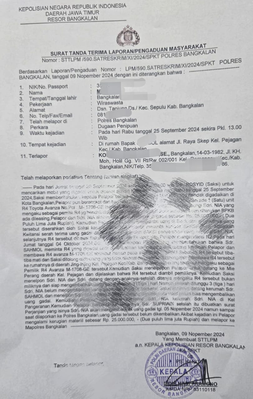“Atas dasar itu, kami membuat laporan ke Polres Bangkalan, dengan tanda terima laporan Nomor: STTLPM/590 SATRESKRIM/XI/2024/SPKT POLRES BANGKALAN, tertanggal 09 November 2024,” cetusnya.