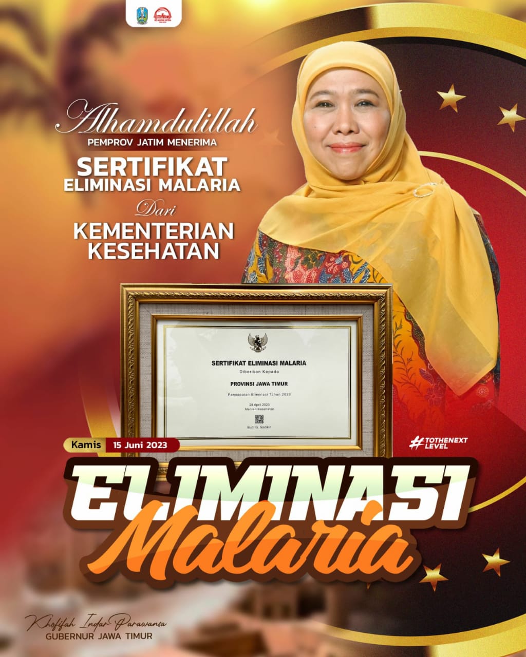 Atas diraihnya sertifikat eliminasi malaria ini, Gubernur Khofifah menyampaikan rasa syukurnya. Menurutnya hal ini menjadi wujud komitmen Pemprov Jatim bersama seluruh stakeholder terkait dalam upaya mengemilinasi kasus malaria di Jawa Timur dengan langkah-langkah konkret dan komprehensif.