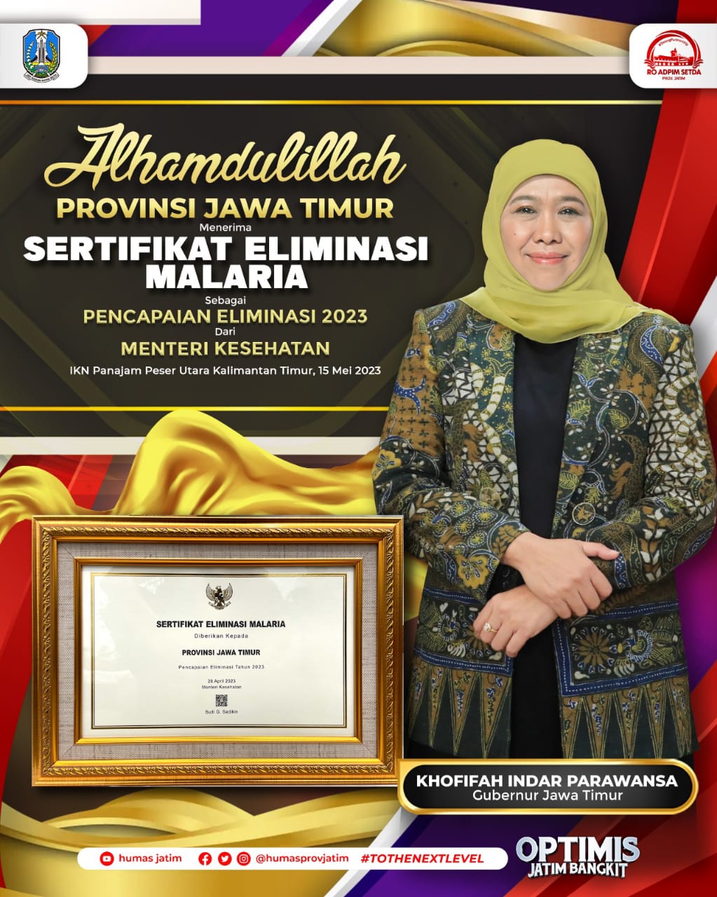 Keberhasilan Jatim Eliminasi Malaria ini ditandai dengan Penyerahan Sertifikat Eliminasi Malaria tingkat Provinsi oleh Dirjen Pencegahan dan Pengendalian Penyakit Kemenkes RI, Dr. dr. Maxi Rein Rondonowu, DHSM.MARS kepada Gubernur Jawa Timur yang diwakili oleh Asisten Administrasi Umum Akhmad Jazuli saat acara Puncak Hari Malaria Sedunia tahun 2023 di Kalimantan Timur, Kamis (15/6).