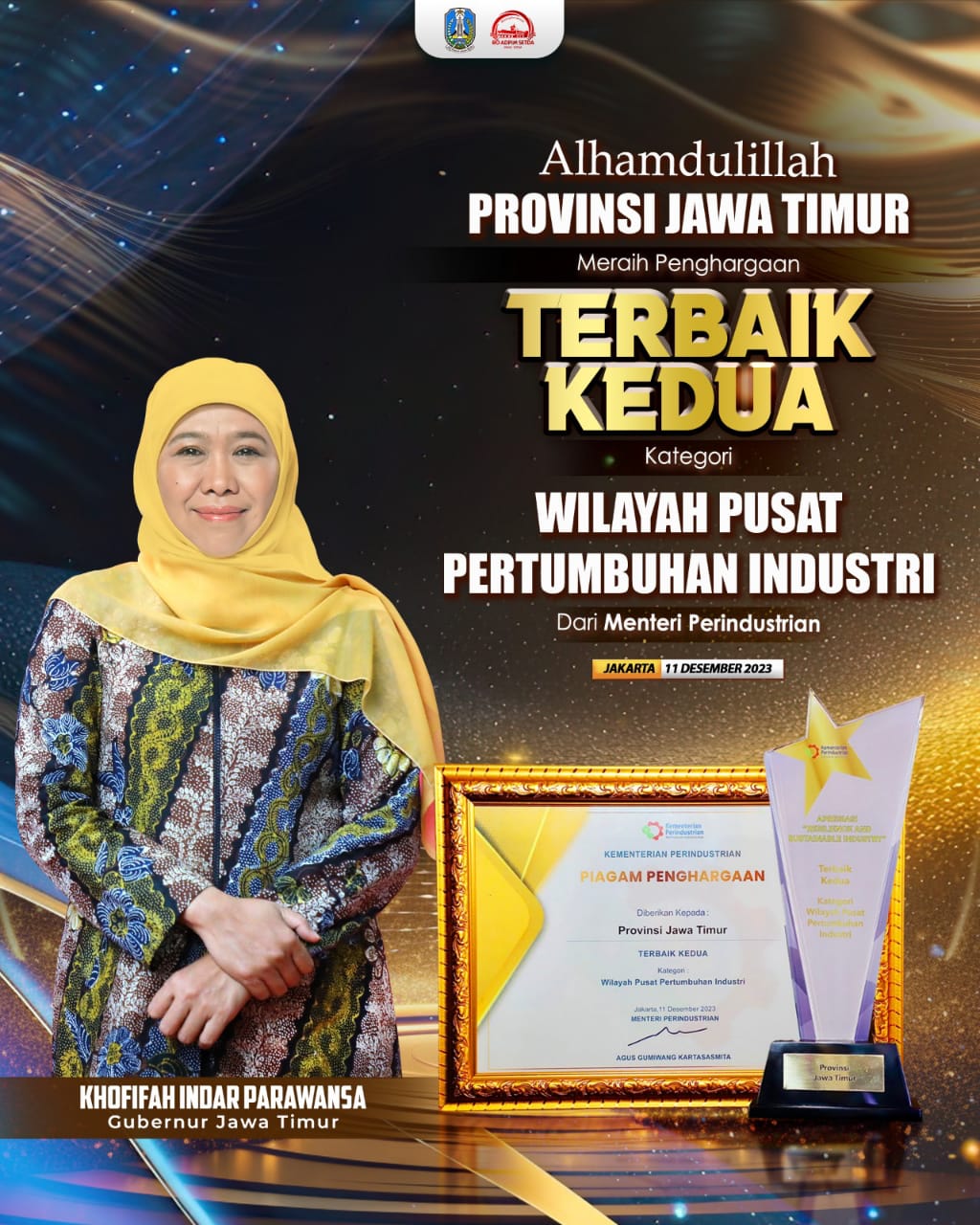 SURABAYA, KOREK.ID – (14 DESEMBER 2023) Pemprov Jawa Timur berhasil meraih penghargaan Resilience and Sustainable Industry Terbaik Kedua untuk kategori wilayah pusat pertumbuhan industri dari Kementerian Perindustrian RI.