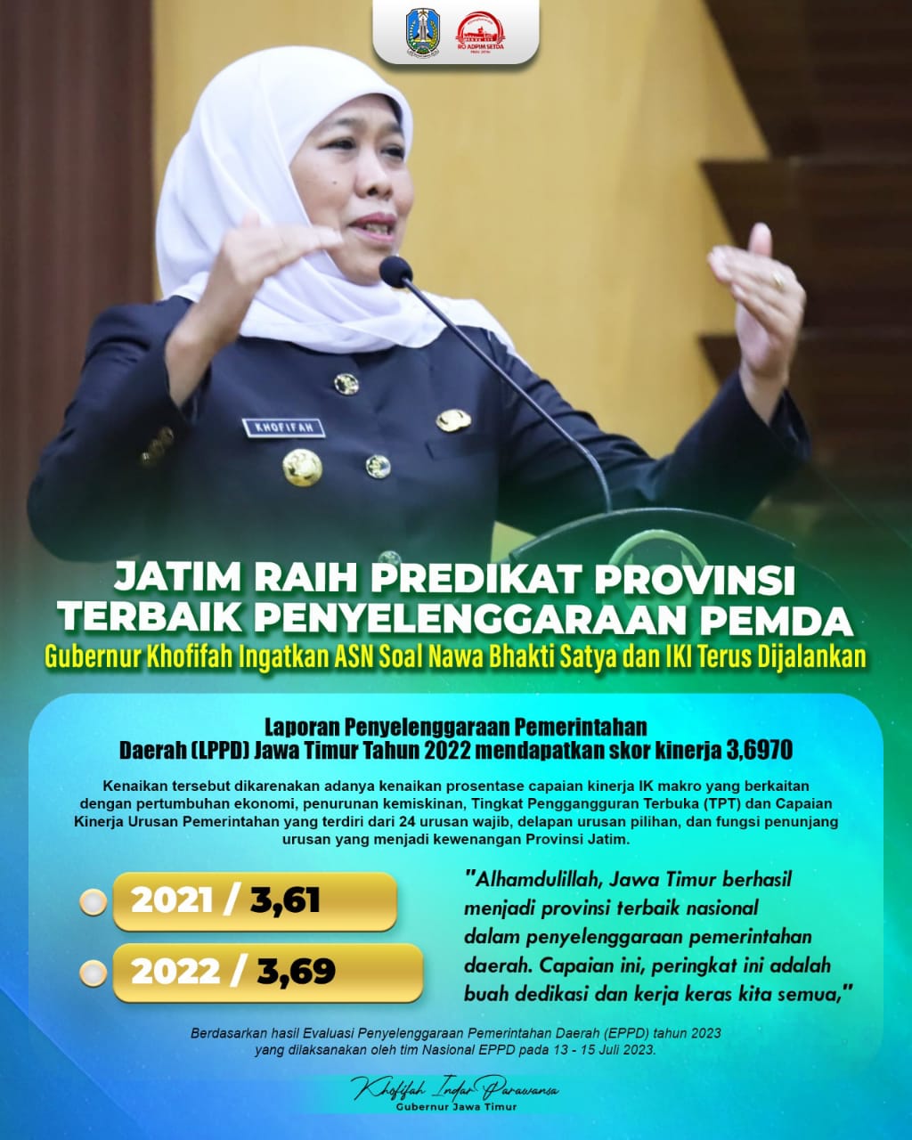“Alhamdulillah, Jawa Timur berhasil menjadi provinsi terbaik nasional dalam penyelenggaraan pemerintahan daerah. Capaian ini, peringkat ini adalah buah dedikasi dan kerja keras kita semua,” ujar Gubernur Khofifah di Surabaya , Senen (29/1).