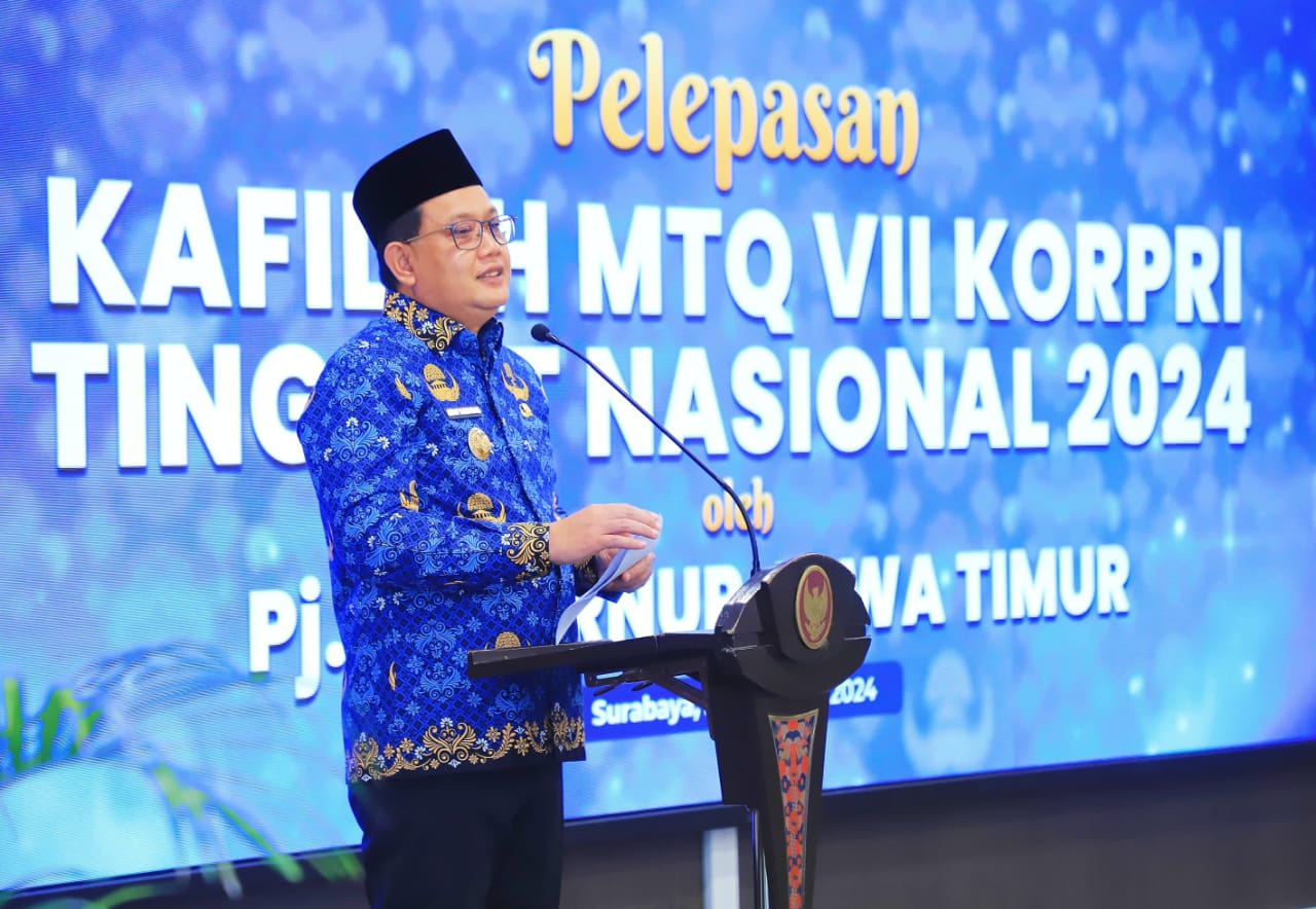 SURABAYA, KOREK.ID – (3 NOVEMBER 2024) Penjabat (Pj) Gubernur Jawa Timur Adhy Karyono melepas kontingen kafilah Musabaqah Tilawatil Quran (MTQ) VII Korps Pegawai Republik Indonesia (Korpri) di Aula lantai V Badan Kepegawaian Daerah (BKD) Jatim, Sabtu (02/11).