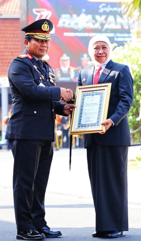 Penghargaan tersebut diserahkan langsung oleh Kapolda Jatim Irjen Pol. Dr. Toni Harmanto, MH kepada Gubernur Khofifah saat upacara peringatan Hari Bhayangkara ke-77 tahun 2023 di halaman Gedung Negara Grahadi, Sabtu (1/7/23).