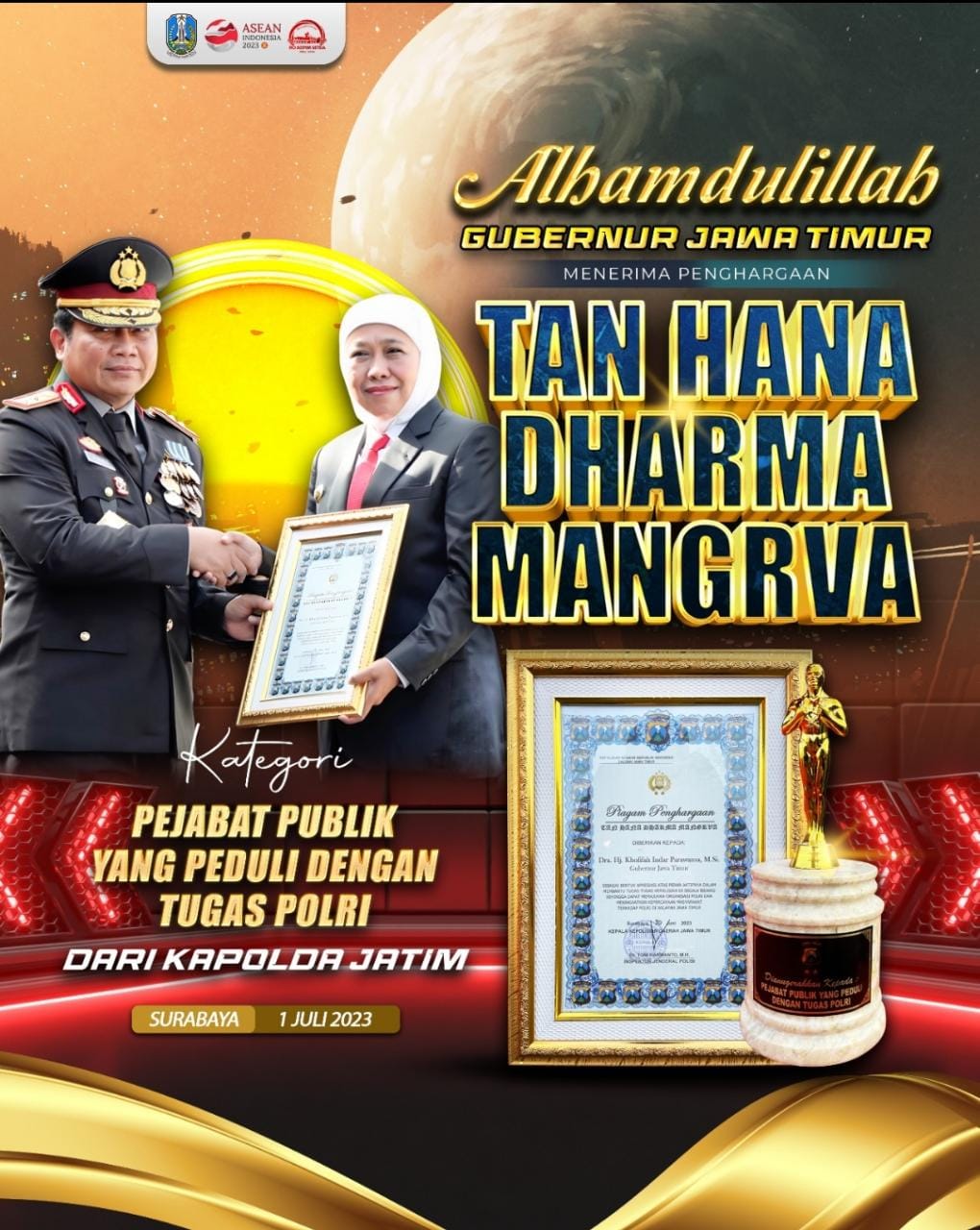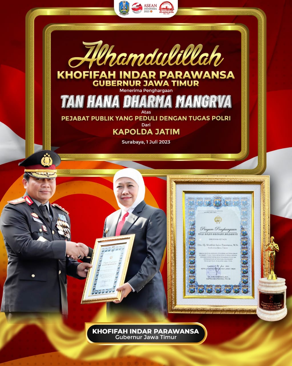 “Alhamdulillah, terima kasih Pak Kapolda Jatim, penghargaan Tanhana Dharma Mangrva ini adalah salah satu bentuk apresiasi dari Pak Kapolda atas sinergitas yang selama ini telah dijalankan diantara Forkopimda di Jawa Timur,” Kata Gubernur Khofifah ditemui usai menghadiri upacara peringatan Hari Bhayangkara ke-77 tahun 2023.