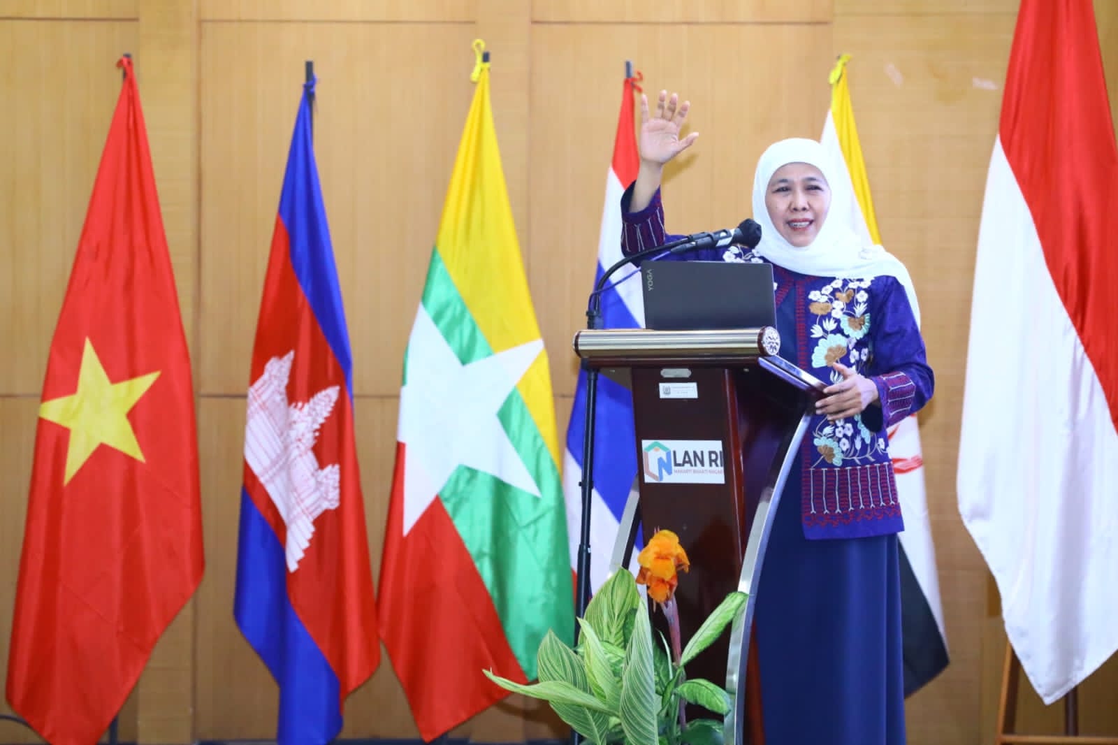 MAKASSAR, KOREK.ID – (25 JULI 2023) Gubernur Jawa Timur Khofifah Indar Parawansa memberikan materi dalam Pelatihan Kepemimpinan Nasional (PKN) Tk.II Angkatan XIV di Pusat Pelatihan dan Pengembangan dan Kajian Manajemen Pemerintahan Lembaga Adminstrasi Negara (Puslatbang KMP LAN) Makassar, Prov. Sulawesi Selatan, Selasa (25/7).