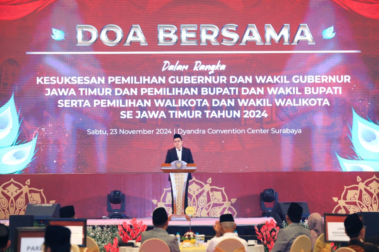 Apresiasi ini disampaikannya saat menghadiri gelaran doa bersama dalam rangka kesuksesan Pemilihan Gubernur dan Wakil Gubernur Jatim, Pemilihan Walikota dan Wakil Walikota, serta Bupati dan Wakil Bupati se-Jatim tahun 2024 di Dyandra Convention Center Surabaya, Sabtu (23/11) malam.