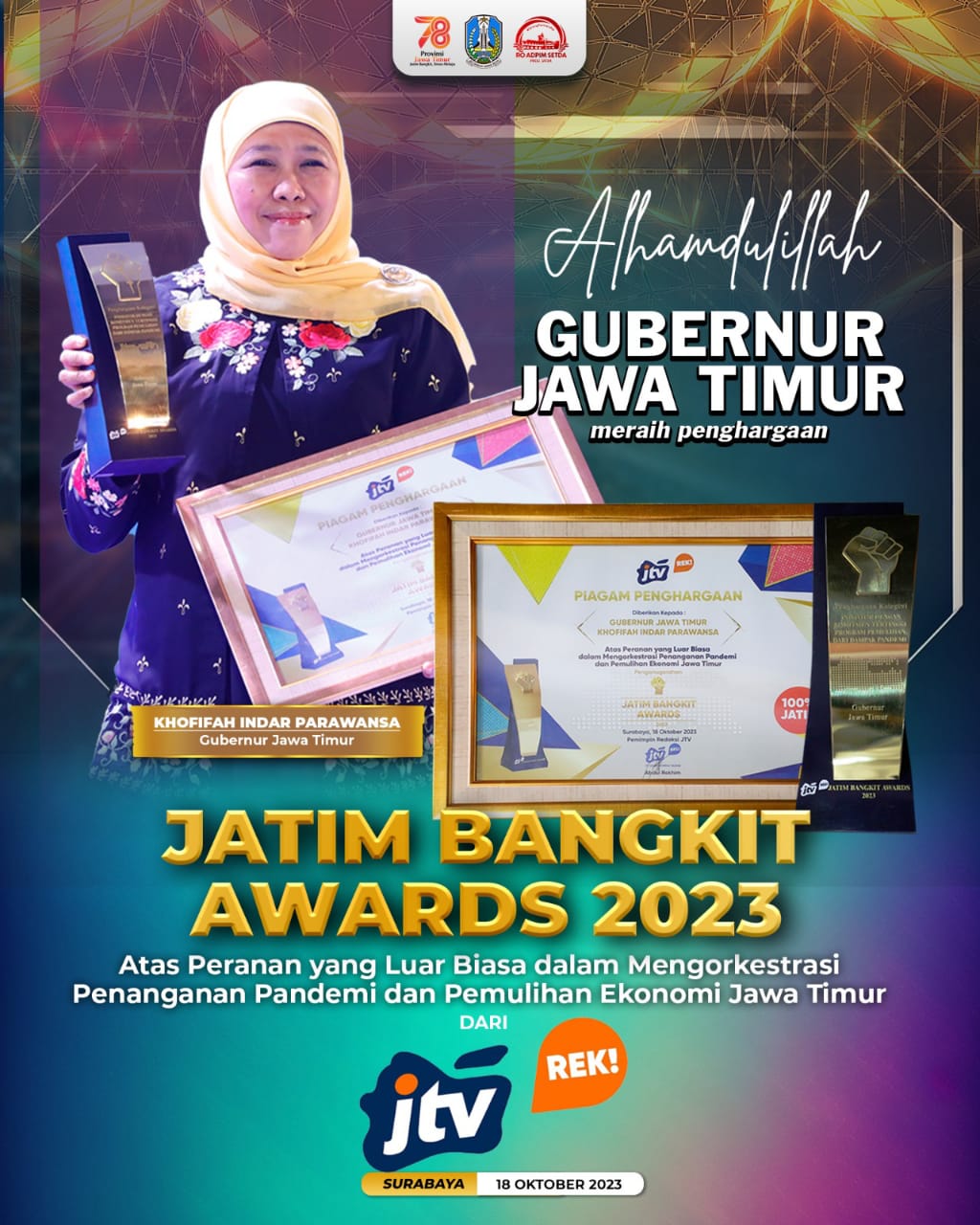 “Melalui Jatim Bangkit Awards kita ingin membangun budaya apresiasi konstruktif dan investasi untuk semua termasuk Provinsi Jatim,” tuturnya.