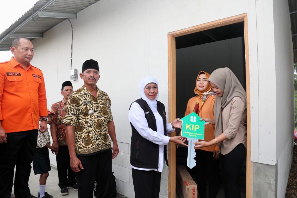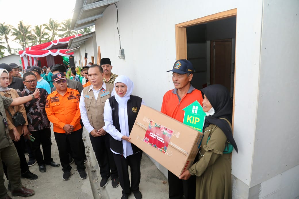 Di akhir acara peresmian huntara, Gubernur Khofifah secara simbolis menyerahkan kunci rumah, kompor dan sembako kepada perwakilan penerima manfaat huntara.