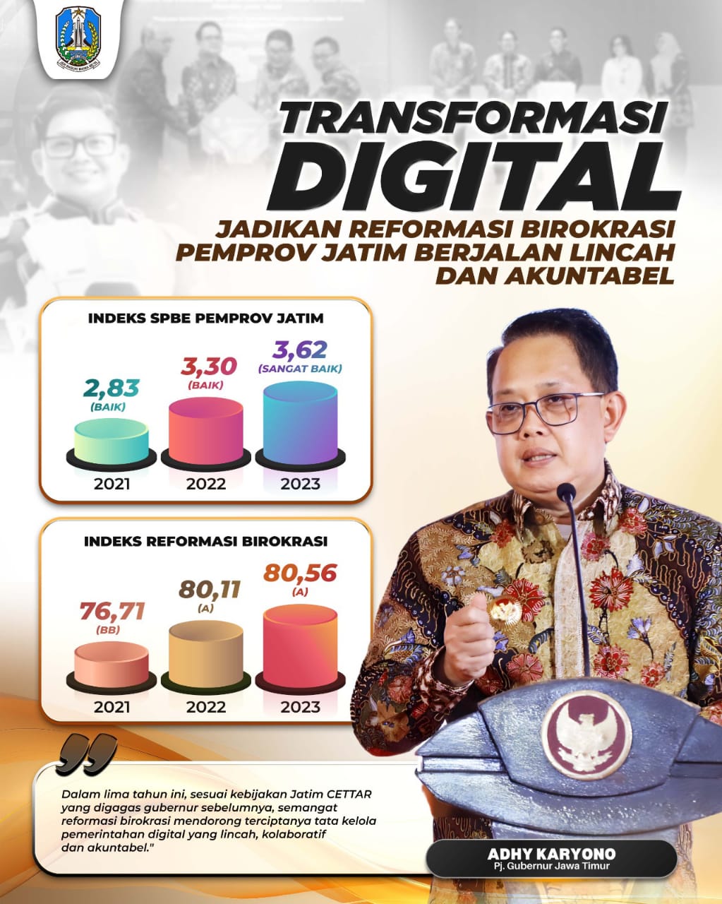 Dalam hal digitalisasi administrasi pemerintahan, Pj Gubernur Adhy menyampaikan salah satu kunci dari reformasi birokrasi ialah transformasi digital. Untuk itu, ia selalu mendorong seluruh Perangkat Daerah Pemprov Jatim untuk terus berinovasi.