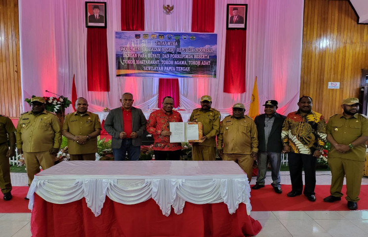 “Sebab tiga DOB akan menjadi pilot project dalam pembangunan, sehingga Ini merupakan keistimewaan bagi orang Papua,” ucapnya. Pada kesempatan tersebut dilakukan penandatanganan surat pernyataan pinjam pakai dan hibah dana, ASN oleh para bupati Mepagoo kepada pemerintah pusat, serta enyerahan tanah hak wilayah adat, penyerahan aset rumah Pj. gubernur Papua Tengah, rumah jabatan dan sekda Papua serta kantor pendukung.